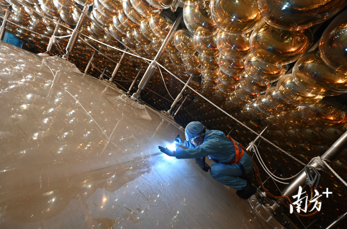 江门中微子实验由中国科学院高能物理研究所于2008年提出构想,2013年得到中国科学院战略性先导科技专项(A类)支持,并在同年得到广东省人民政府的支持,2015年启动隧道和地下实验室建设。2021年12月完成实验室建设并开始了探测器在地下实验室的安装建设,2024年12月探测器主体建设完成并开始灌注超纯水与液体闪烁体。在灌装过程中,项目团队首先在45天内完成超过6万吨超纯水的灌注,将内外有机玻璃球的液位差控制到厘米量级,流量偏差不超过0.5%,有力保障了探测器主体结构的安全稳定。随后历经半年的精细操作,将2万吨液体闪烁体精准注入直径35.4米的有机玻璃球内,并同步完成原有纯水的置换。尤为关键的是,超纯水与液体闪烁体的超高洁净度、透明度和极低放射性本底等特殊要求全部得到满足。与此同时,项目团队完成了探测器的调试优化,确保了探测器在灌注完成后立刻进入正式运行取数阶段。